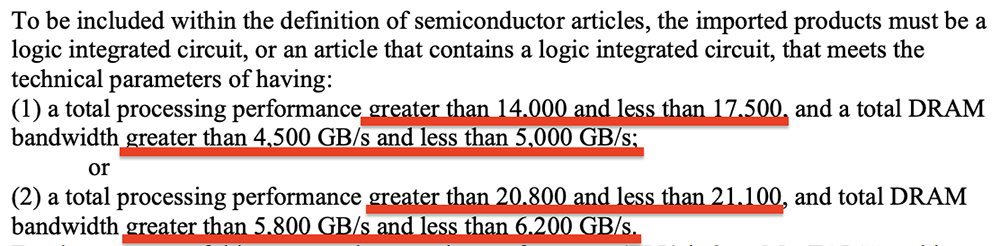 美国商务部长认为,美国出产半导体、某些半导体系体例制设备(例如先辈的光刻和蚀刻东西)及其衍出产品的能力不脚以满脚本土需求。这导致美国不得不依赖境外来历来满脚本土对半导体、半导体系体例制设备及其衍出产品的需求。特朗普要求美国商务部长继续监测半导体、半导体系体例制设备及其衍出产品的进口环境,并应正在2026年7月1日前向特朗普供给美国数据核心所用半导体市场的最新环境,以便确定能否适宜点窜本通知布告中的关税。据美国白宫环境仿单,正在不久的未来,特朗普可能会对半导体及其衍出产品的进口征收更普遍的关税,并推出响应的关税抵消打算,以激励美国本土制制业成长。按照美国白宫总统步履附件,正在集成电上的所有处置单位上相加。“MacTOPS”是每秒进行多沉累积计较(D=A×B+C)的理论峰值数。TPP公式中的2基于将一次乘法累加计较(D=A×B+C)计较为两次操做的行业老例,用于产物数据表。因而,2דMacTOPS”可能对应于产物数据表告的TOPS或FLOPS。乘法累加运算的“操做位长度”是乘法运算输入的最大位长度。进口产物的TPP是将集成电上每个处置单位的TPP加正在一路确定的:TPP=TPP1+TPP2+…+TPPn(此中n为集成电上处置单位的数量)。“MacTOPS”的比率应按理论上可能的最大值计较,被认为是制制商正在年度或手册中声称的集成电的最高值。例如,若是集成电是为MAC计较设想的,有多个比特长度实现分歧的“TPP”值,则应利用最高的“TPP”值。对于同时供给稀少矩阵和稠密矩阵处置的集成电,“TPP”值是处置稠密矩阵(例如,没有稀少性)的值。“总DRAM带宽”是指集成电(IC)和动态随机存取存储器(DRAM)IC之间的总内存带宽,单元为千兆字节/秒,包罗共封拆DRAM IC和非共封拆DRAM IC,不包罗通过互连介质近程拜候的DRAM IC的带宽。共封拆DRAM包罗高带宽内存(HBM)等。非封拆DRAM IC包罗图形双数据速度(DR)IC等。
